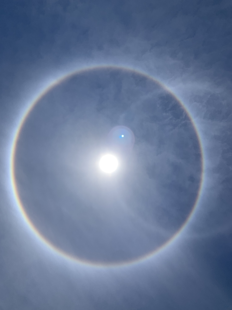 調べてみるとこれは「ハロ」と呼ばれていて、太陽に薄い雲がかかった時に、その中の氷の粒に光が反射して起こる現象だそうです。